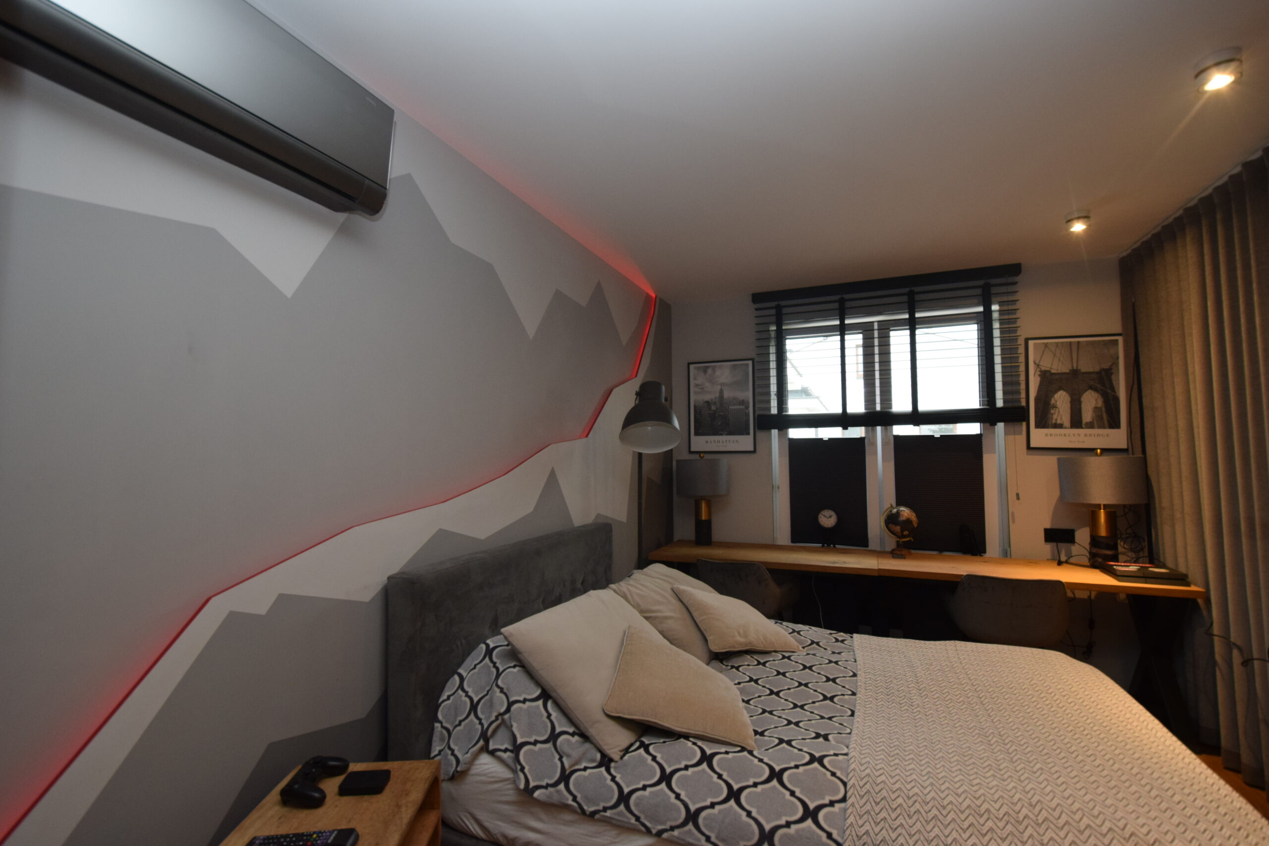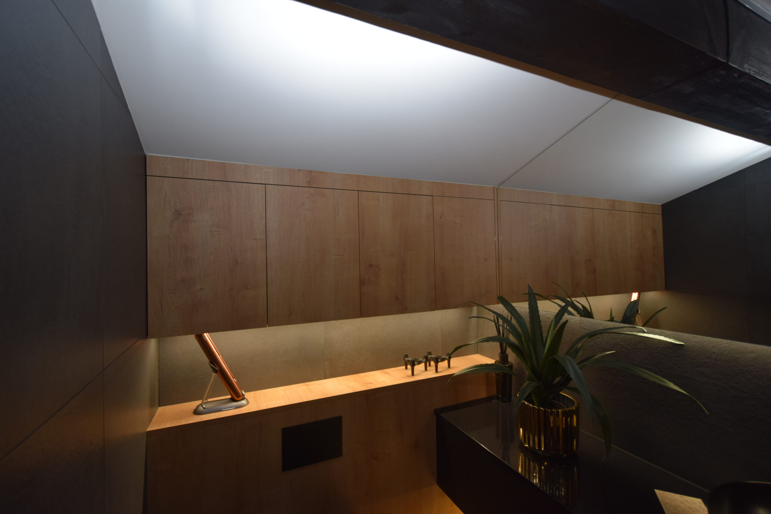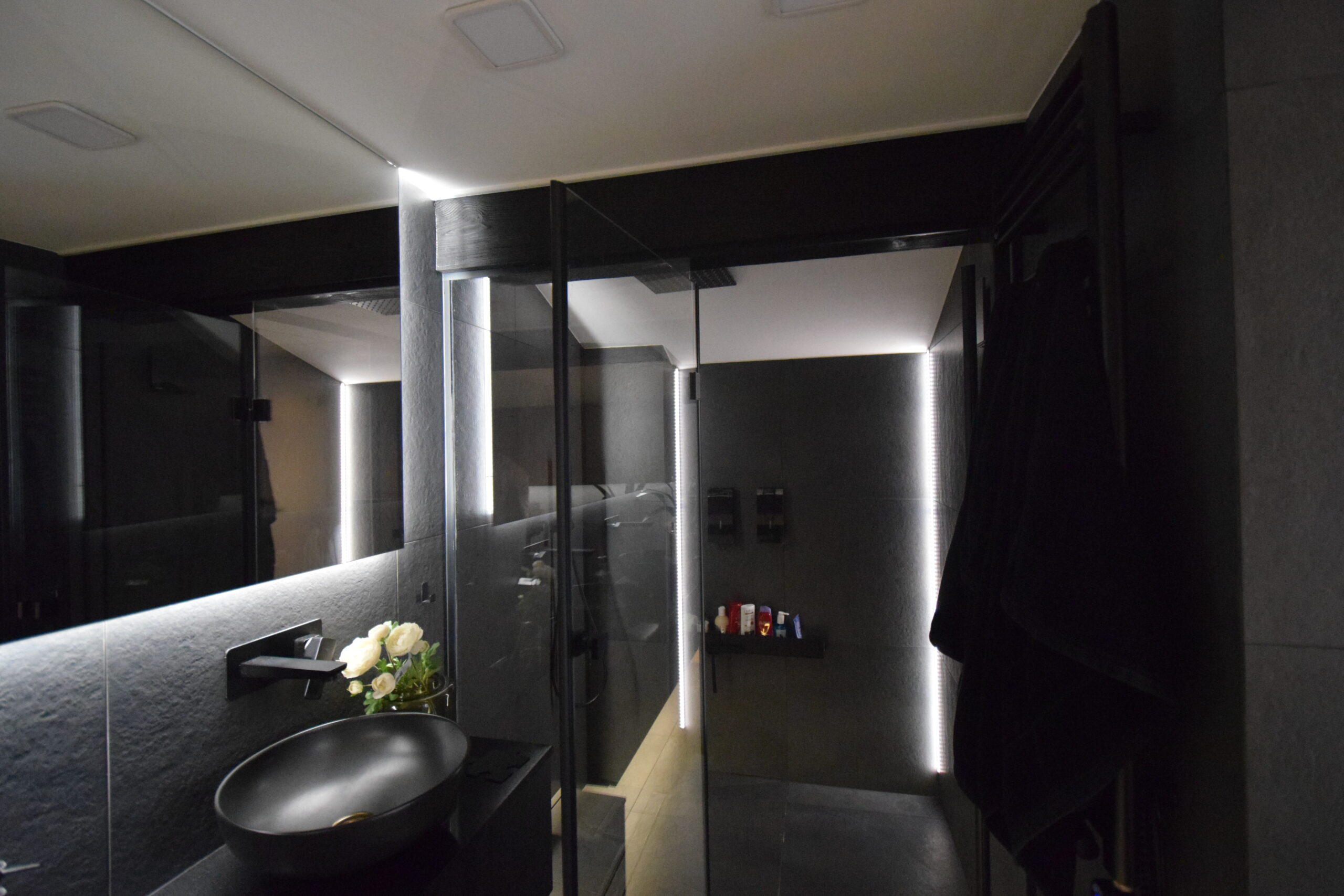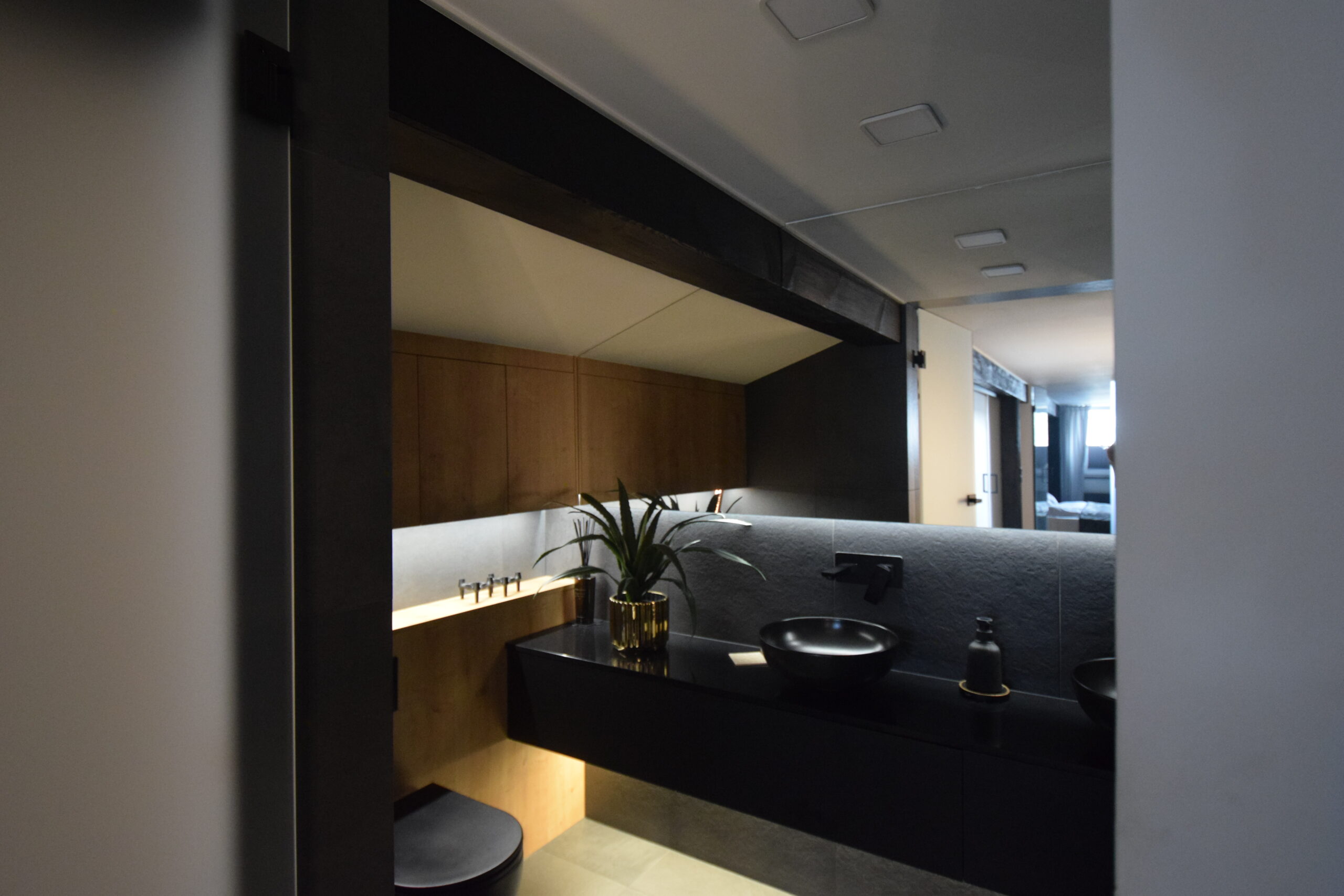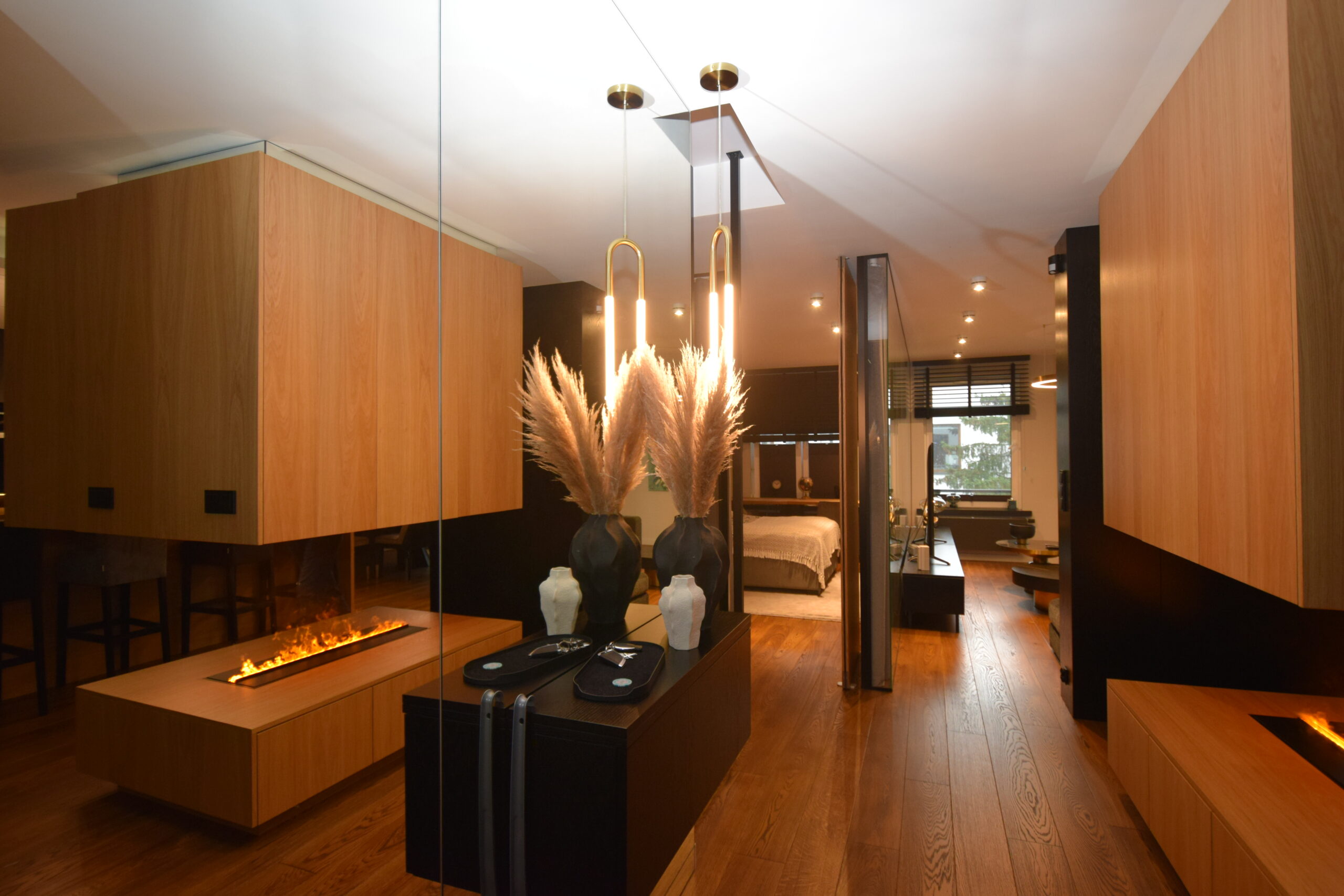 - sypialnia (15,81 m²) o nowoczesnym, designerskim charakterze – ze szklaną ścianą i ambientowym podświetlanym wykończeniem,