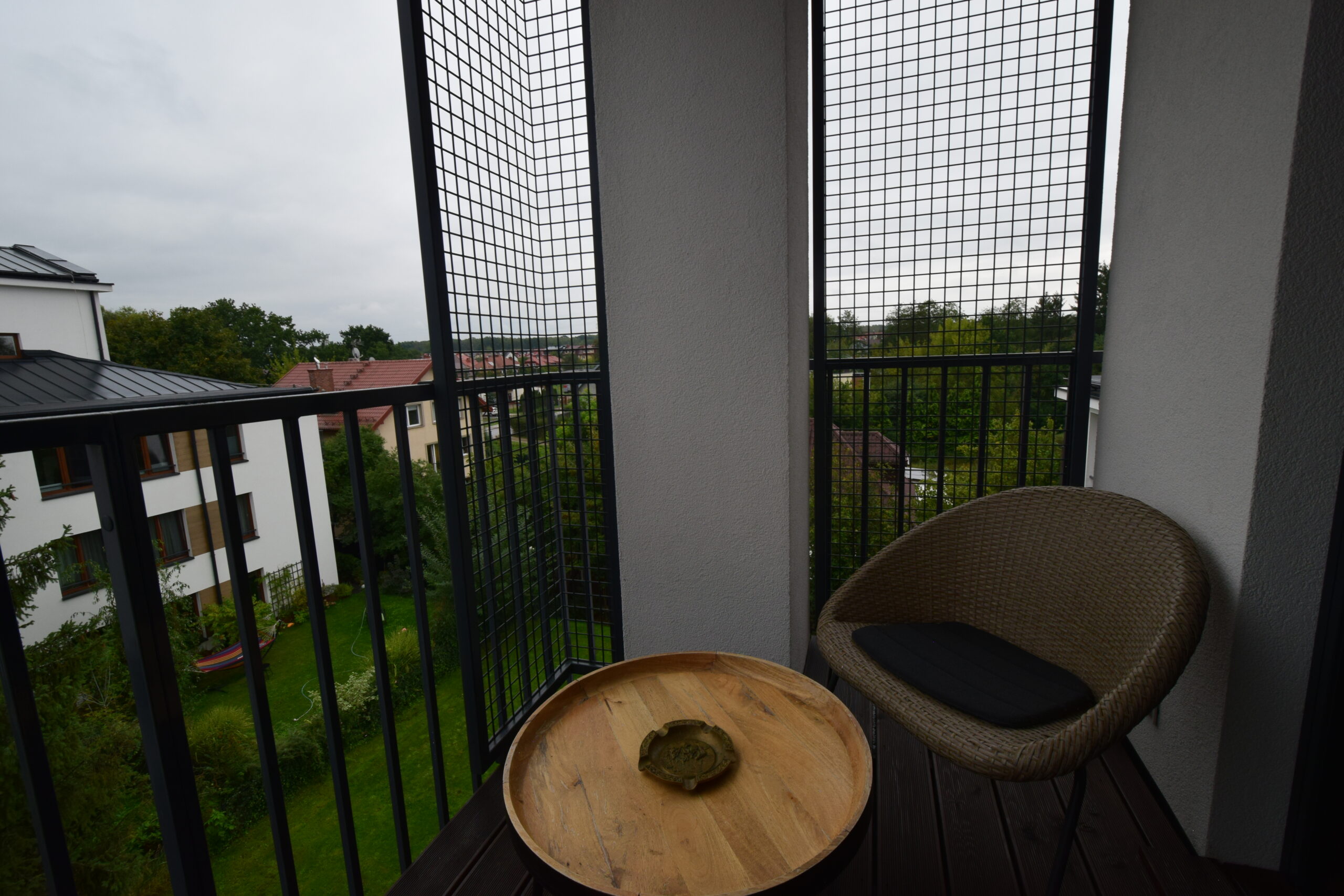 Do apartamentu prowadzi kameralny korytarz lub winda bezpośrednio z poziomu garażu podziemnego. Niewielka liczba lokali na piętrze oraz widok z okien i balkonu na zamknięty, zielony dziedziniec – na którym podczas budowy celowo zachowano rosnące drzewo – gwarantują ciszę, prywatność i komfort, z dala od miejskiego zgiełku.